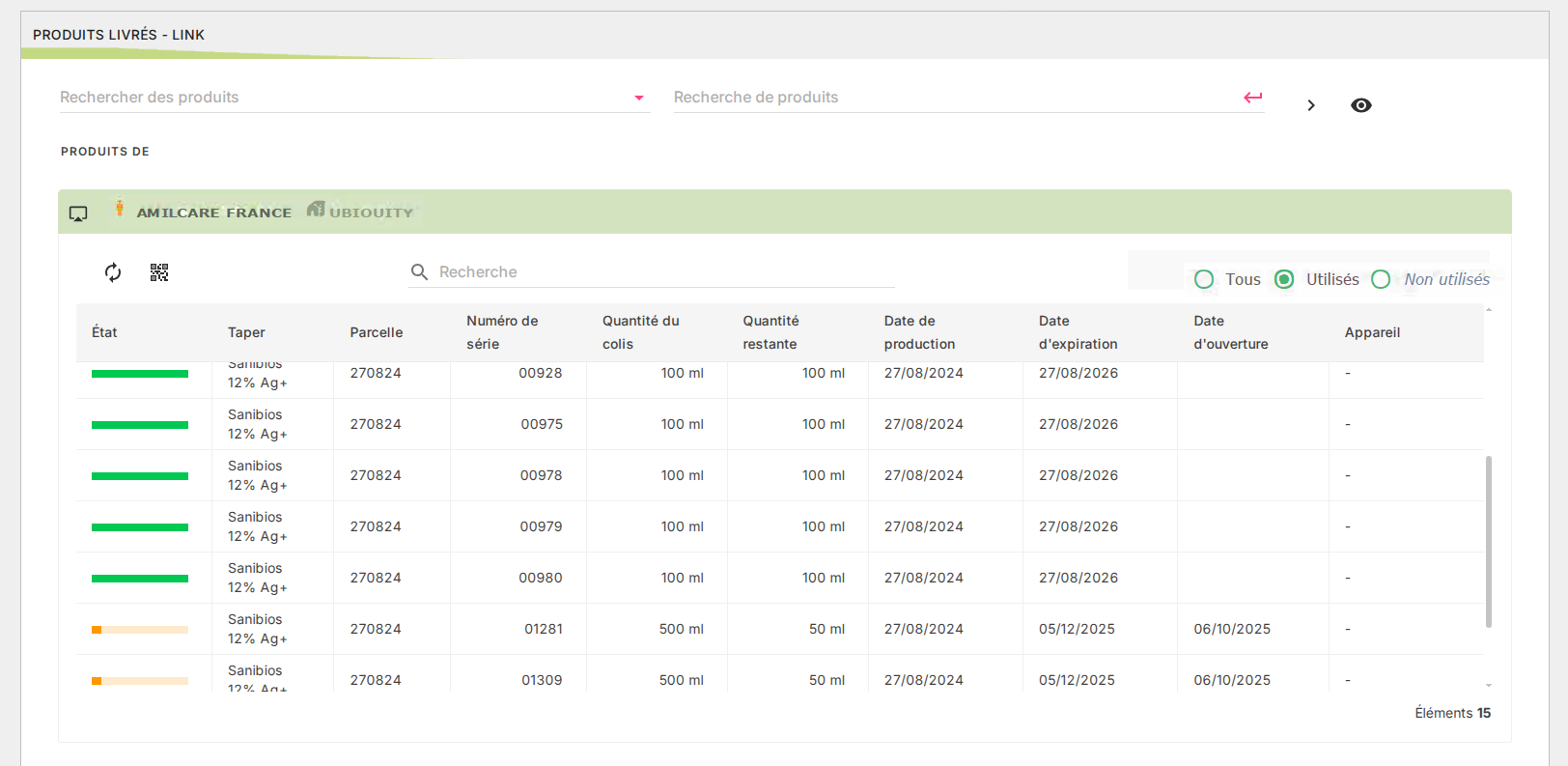 La plateforme suit également l’ensemble des consommables utilisés : numéros de lot, dates d’ouverture et d’expiration, quantités restantes, statut d’utilisation. Cette gestion automatisée permet de sécuriser les approvisionnements et d’éviter toute utilisation de produit périmé.